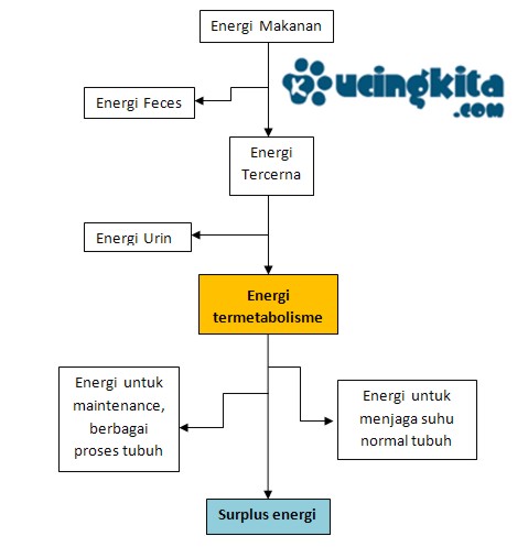 makanan yang dimakan menghasilkan dua macam "sampah" yaitu feces  (kotoran/pup) dan urin (kencing), sisanya adalah energi/makanan termetabolisme (kotak kuning). Energi  inilah yang bisa dimanfaatkan oleh tubuh. Percuma saja protein tinggi dan berbagai macam vitamin yang banyak dalam makanan tetapi tidak bisa dicerna dan dimetabolisme tubuh karena dibuang jadi feces atau urin.